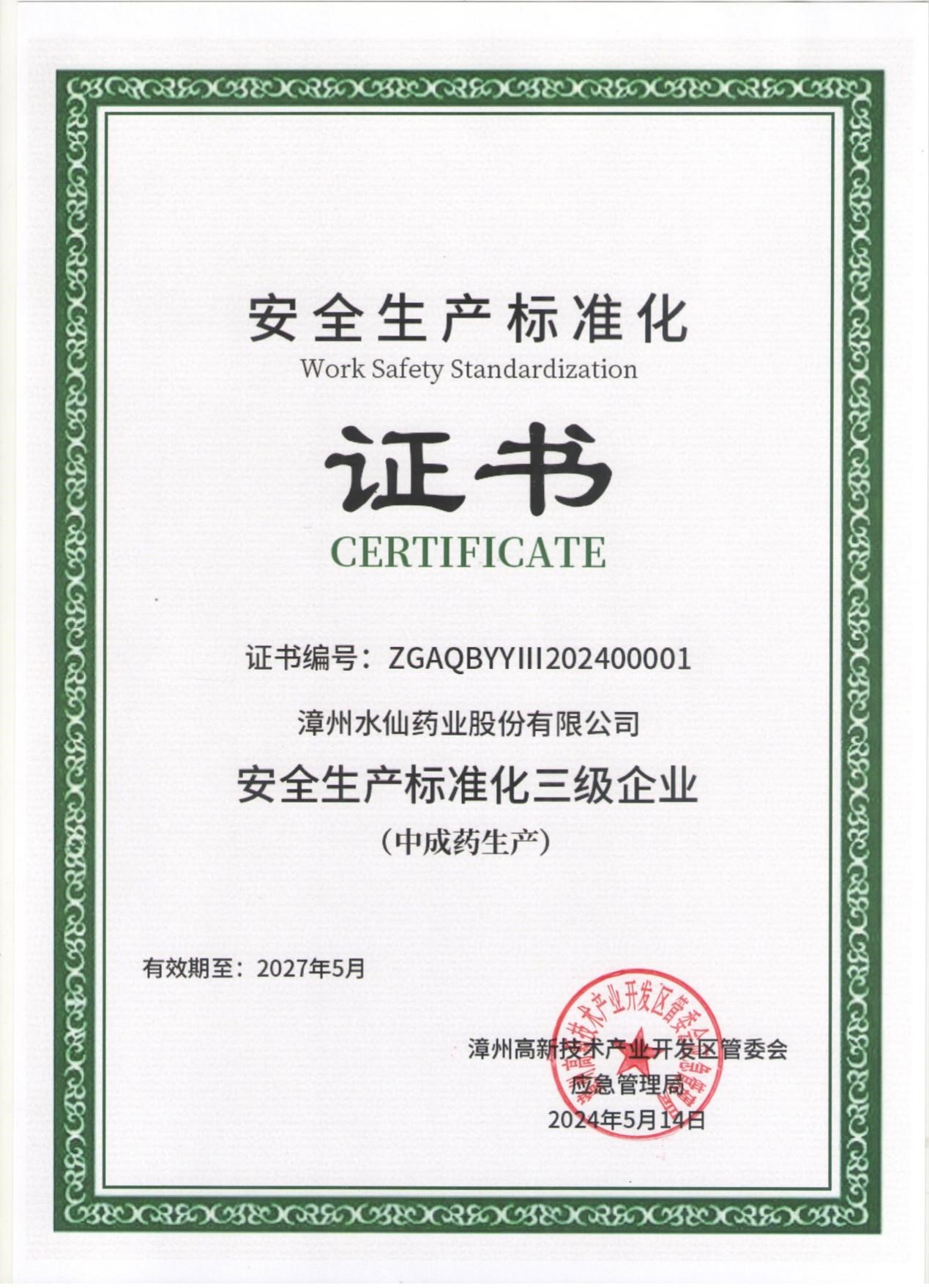 漳州水仙成功取得“安全生產(chǎn)標準化三級企業(yè)證書”