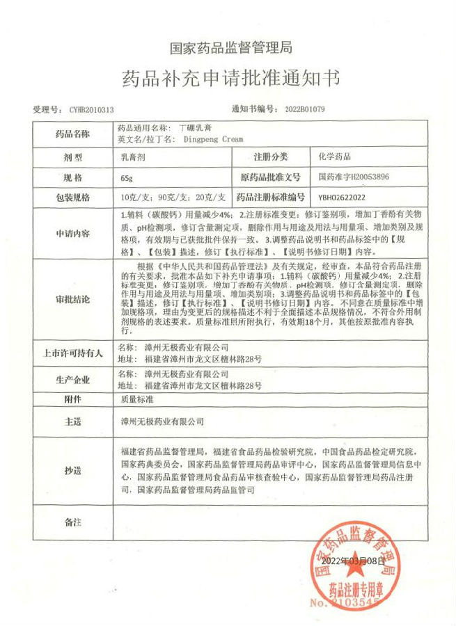 2018年9月無極公司啟動丁硼乳膏質(zhì)量提升工作,在技術(shù)中心、質(zhì)量管理部、生產(chǎn)部等部門與北京CRO公司的通力協(xié)作下,歷時3年多,經(jīng)過實驗室小試、中試、商業(yè)批次放大生產(chǎn)以及產(chǎn)品的穩(wěn)定性考察、資料申報各個環(huán)節(jié),無極公司于2022年3月8日收到國家藥品監(jiān)督管理局藥品補充申請批準(zhǔn)通知書,丁硼乳膏質(zhì)量提升補充申請正式獲得國家藥監(jiān)局批準(zhǔn)。