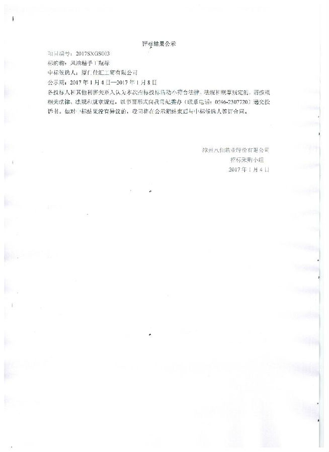 漳州水仙藥業(yè)股份有限公司常用大宗包裝材料評標(biāo)結(jié)果公示